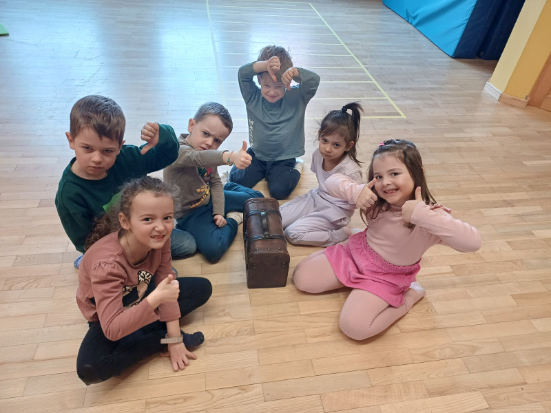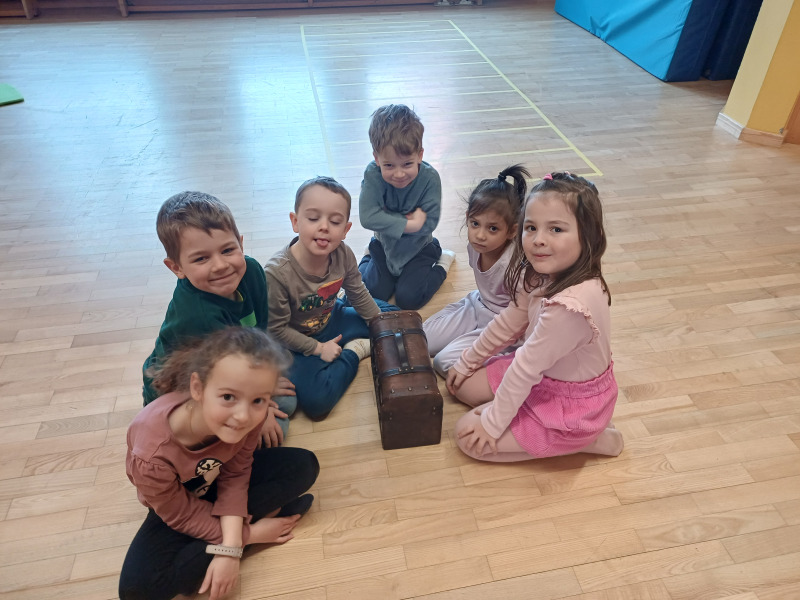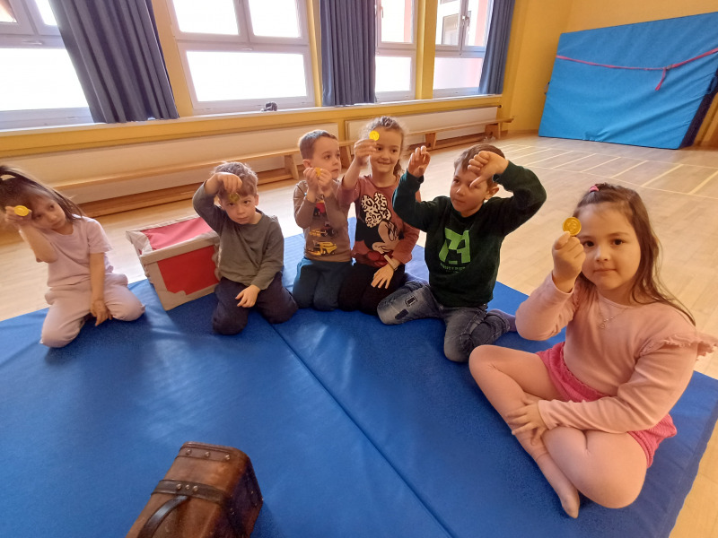 Piratenreise mit Conny & Chiara- 4.Insel „Rhythmus & Muster“, 4.Tag- Schatzstunde: Am vierten Tag auf der Insel des Rhythmus und der Muster erreicht ihr endlich das Dorf im Dschungel! Unterwegs lernen die Kinder die „Silbensprache“. Im Dorf angekommen hat der Häuptling der Inselbewohner noch eine Bitte an euch, bevor er euch verrät, wo ihr den Schatz findet. Die letzte Stunde der 4. Insel beinhaltet eine Hinführung zum Schwerpunkt der nächsten Insel, der phonologischen Bewusstheit. Außerdem gibt es mit dem Spiel „Alte Kiste“ nochmal eine Fördersituation zum Thema mathematische Grundkompetenzen: Die Kinder zählen und ordnen verschiedene Gegenstände und beschäftigen sich dabei damit, dass Zahlen verschiedene Bedeutungen haben können: So kann eine Zahl sowohl eine Menge bezeichnen (vier Wäscheklammern, fünf Kastanien, …) als auch als Ordnungszahl dienen und also einen Punkt innerhalb einer Reihe markieren (das erste Feld, das zweite Feld, …).