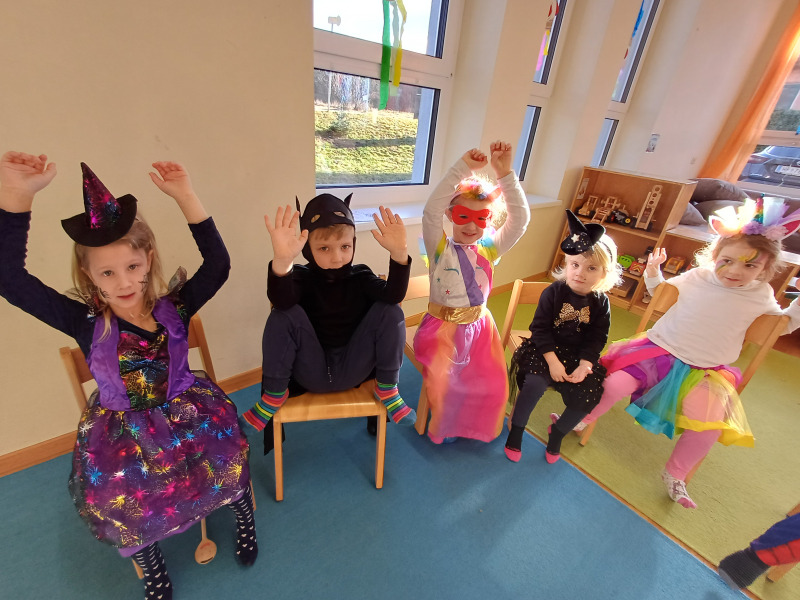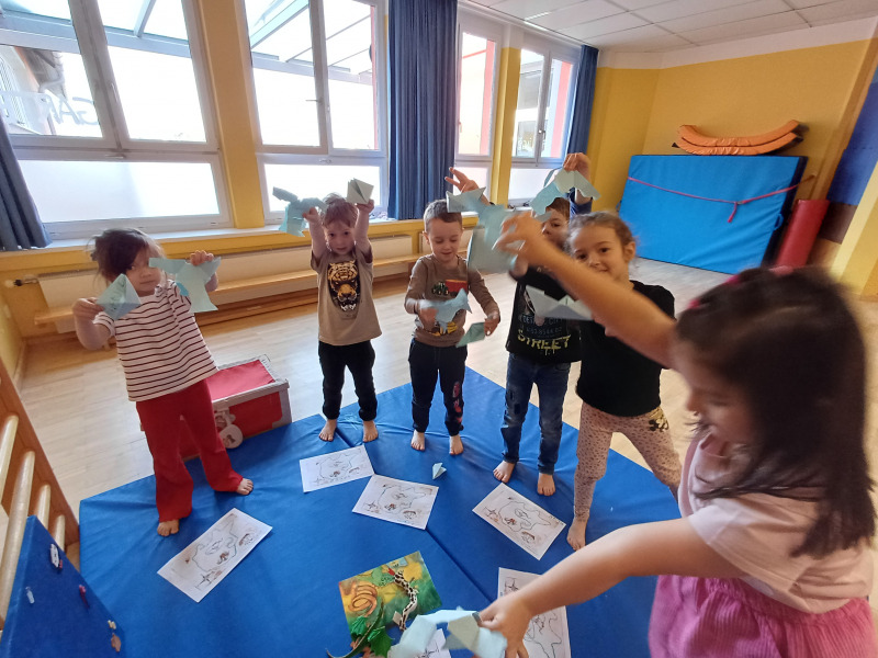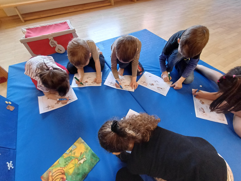 Piratenreise mit Conny & Chiara, 5.Insel „Reime & Sprachspielereien“, 1.Tag: Die Piraten haben den Anker vor der 5. Insel ihrer Reise geworfen – der Insel der Reime und Sprachspielereien. Hier lebt der Lauschdrache, der in seinem Vulkan einen Schatz hütet. Natürlich machen sich die Piraten auf zum Vulkan! Auf der 5. Insel dreht sich alles um die phonologische Bewusstheit – einer zentralen Vorläuferfähigkeit für das Lesen und Schreiben. Um gleich zu Beginn der Insel einen Überblick zu bekommen, ob die Kinder Wörter schon gut in Silben zerlegen, Reime erkennen und Anlaute heraushören können, gibt es in dieser Stunde mit dem „Dschungelausflug“ einmal ein 1:1-Setting zum gezielten Beobachten. Achtung: Um den „Dschungelausflug“ gut umsetzen zu können, musst du in dieser Stunde zu zweit sein! Eine:r geht mit den Kindern jeweils einzeln in den „Dschungel“. Der/die andere bleibt bei der Gruppe, in der die Kinder verschiedene andere Aufgaben erhalten.